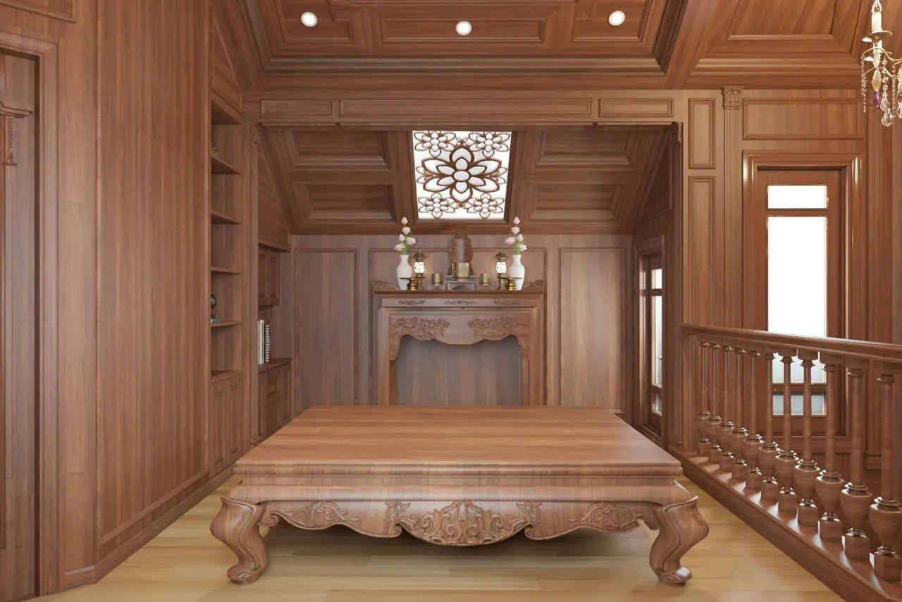 Phòng thờ gia tiên là nơi thiêng liêng để tưởng nhớ ông bà tổ tiên. Thông thường, không gian này được làm từ gỗ tự nhiên, chạm khắc hoa văn sen hoặc chữ vạn, thể hiện đậm nét văn hóa truyền thống của người Việt.